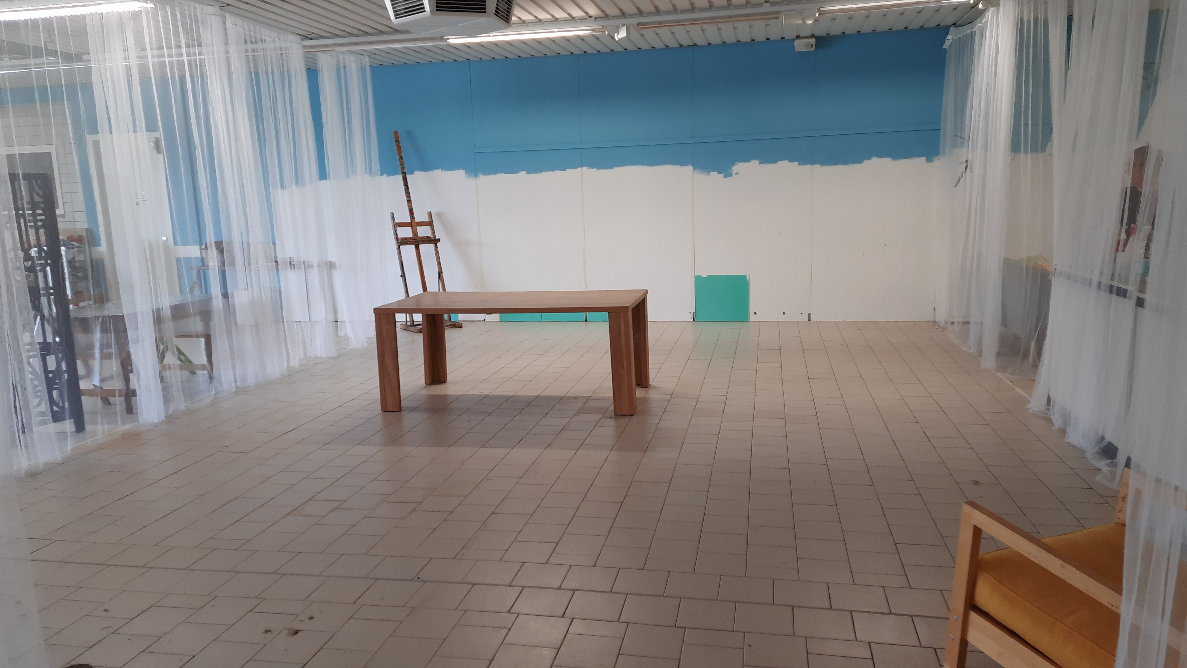 Ik werk al heel lang in mijn atelier thuis en was niet echt op zoek naar iets anders. Maar deze mogelijkheid kwam zomaar op mijn pad. En het leek me leuk om het experiment aan te gaan. Wie weet heeft het positieve invloed op mijn werk. Qua ruimte zou ik lekker groot kunnen gaan denken en werken. Het is namelijk 8 x 6 meter!